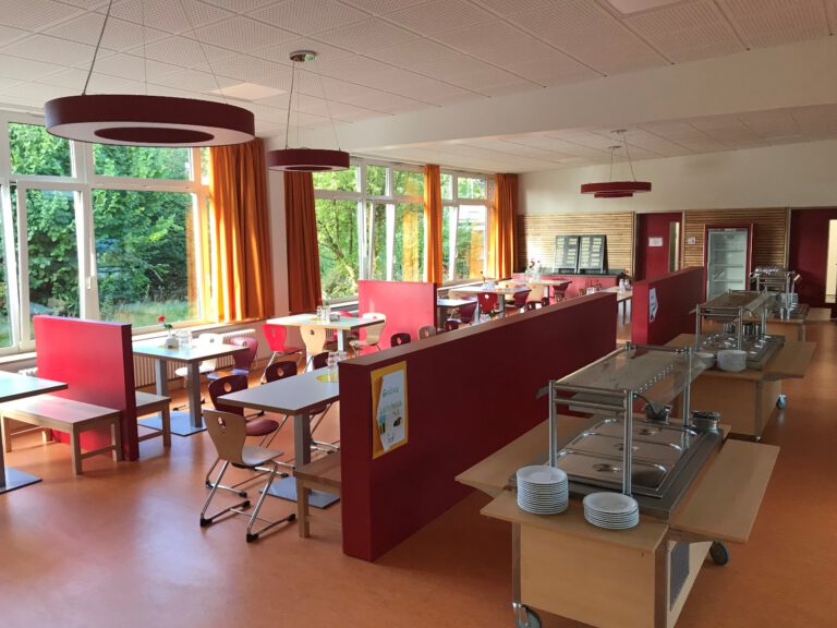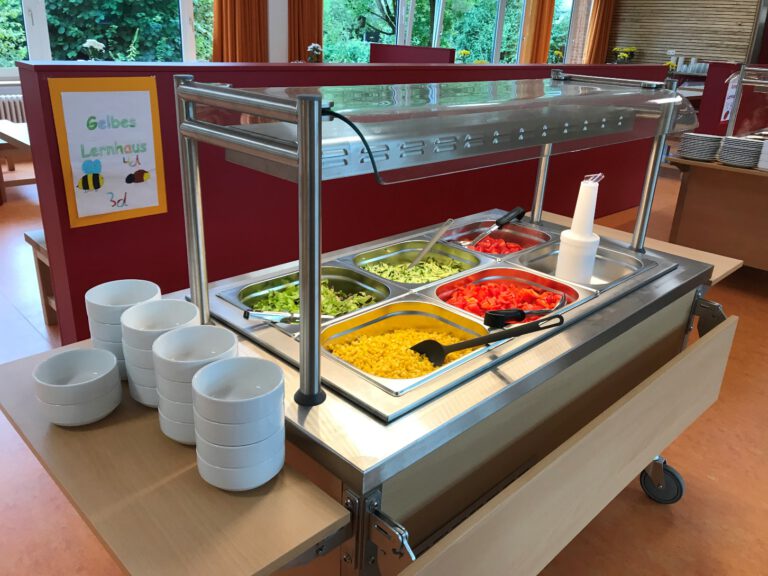 Das Essen wird von unserem Mensaanbieter „Rebional“ täglich frisch in der Mensaküche zubereitet. Entsprechend des Oldenburger Rahmenkonzepteszur Schulverpflegung werden viele Zutaten in Bio-Qualität angeboten. Es gibt jeden Tag zwei verschiedene Menüs sowie ein umfangreiches Gemüse- und Salatbüffet, aus dem die Kinder einen bunten Teller zusammenstellen können. Zum Nachtisch gibt es immer frisches Obst und eine Milchspeise oder Ähnliches (Jogurt, Quark, …). Die Kinder können jeden Tag ein vegetarisches Menü zusammenstellen.